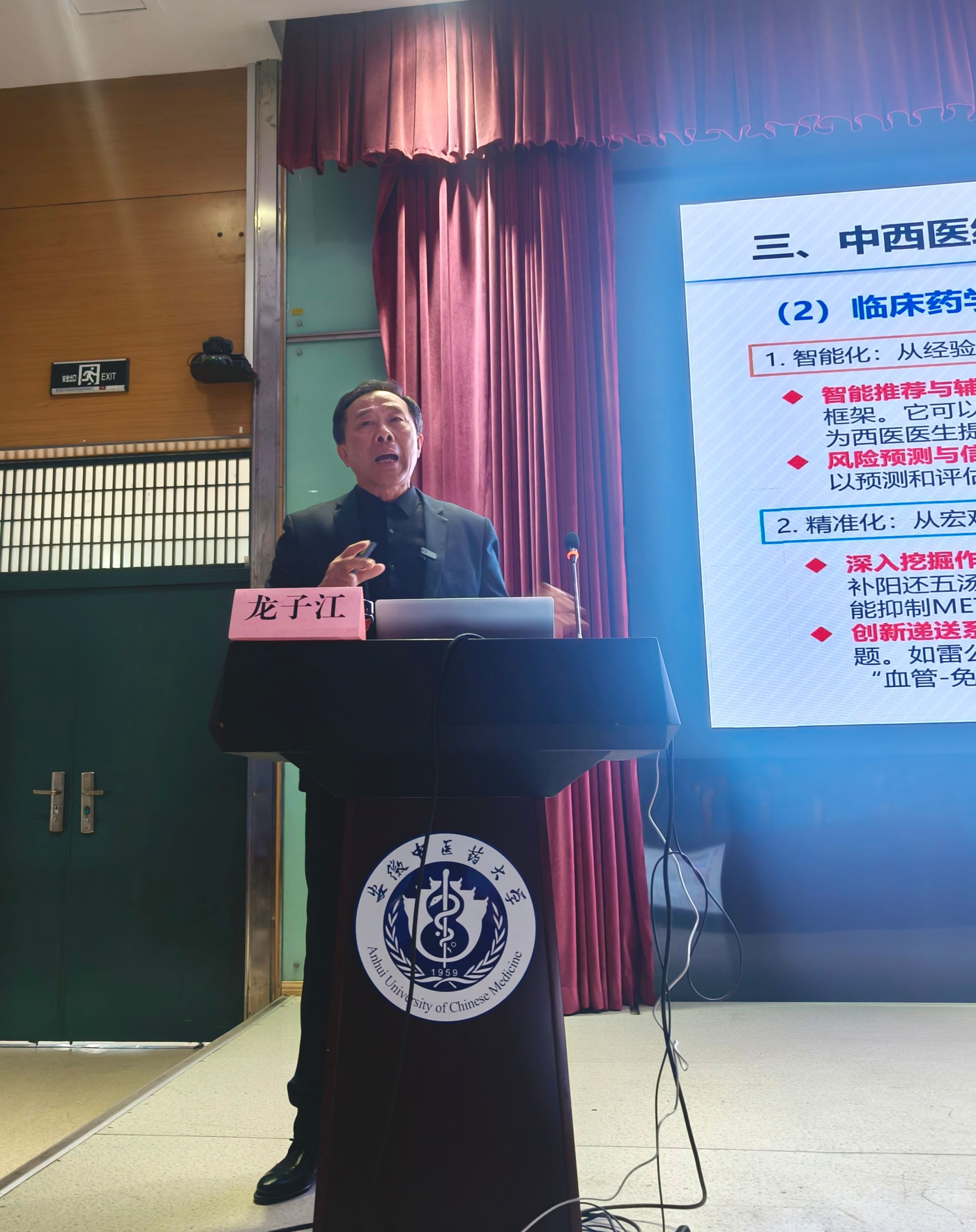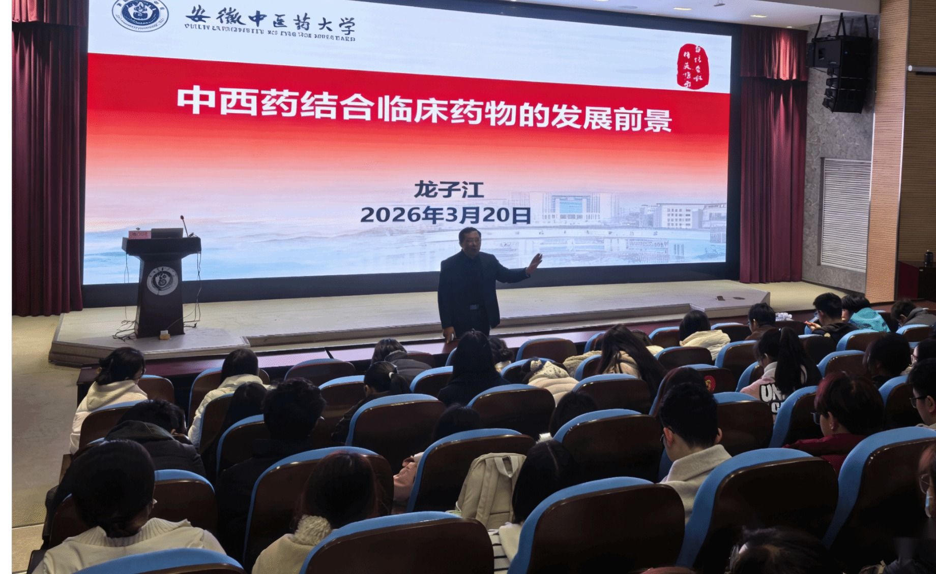 龙子江是安徽中医药大学教授、教学督导,安徽省教学名师,长期从事中药及其复方对心脑血管、生殖系统疾病作用机制研究,在药理学、中西药结合临床研究领域拥有深厚学术积淀与丰富实践经验。讲座中,龙子江从中西医结合临床药学概述、治疗优势、研究方向与发展前景四大板块展开讲述,明确指出中西医结合并非简单药物联用,而是诊断互参、治疗互补、理论互启的系统整合,可实现 “1+1>2” 的临床疗效。并逐一破除“中药只能治慢病”“中药无毒副作用”等常见认知误区,结合肿瘤辅助治疗、心血管疾病、糖尿病肾病等临床实例,生动阐释中西药结合增效减毒、优势互补、整体调节的核心价值。龙子江还重点介绍了中西医结合临床药学在智能化、精准化、机制化、系统化、循证化方向的研究进展,以及AI技术、太空医学等前沿领域为中西药结合带来的新机遇,引导同学们立足专业、放眼未来,深刻认识中西医结合在新时代医学发展中的使命与担当。