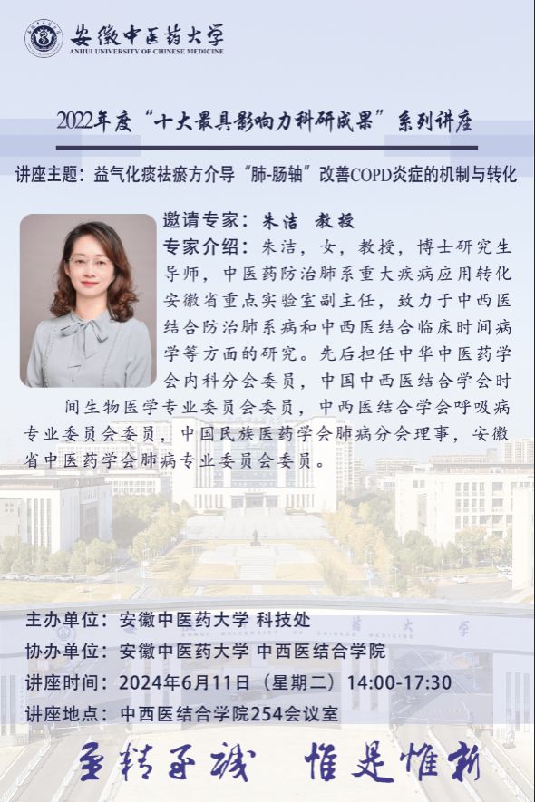 2022年度“十大最具影响力科研成果”系列讲座-讲座主题:益气化痰祛瘀方介导“肺-肠轴”改善COPD炎症的机制与转化