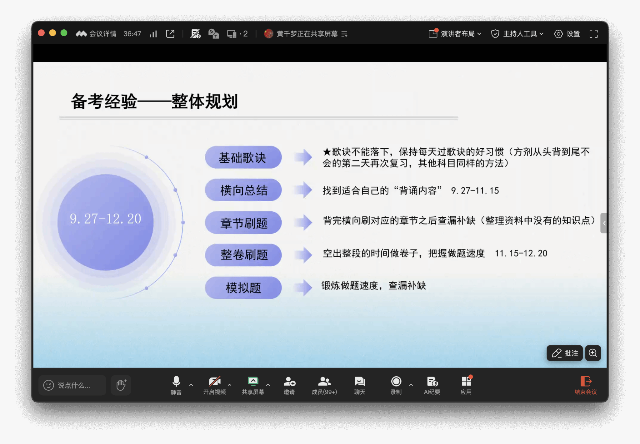 在经验分享环节,五位优秀2025届毕业生结合自身备考经历,从不同角度倾囊相授。黄千梦系统梳理了专业课的全程复习规划与高效学习方法;桑梦奇聚焦院校与专业选择,分享了如何精准定位、搜集信息;刘婧雅则围绕专业课备考,强调了知识体系构建与历年真题精析的重要性;范彬彬深入讲解了公共课复习的关键环节与应对技巧;王明阳从心态调整与时间管理入手,为学弟学妹们提供了实用的备考策略与经验支持。在随后的自由交流环节,同学们踊跃提问,围绕复习重点、备考节奏等具体问题与主讲人进行了深入交流。
