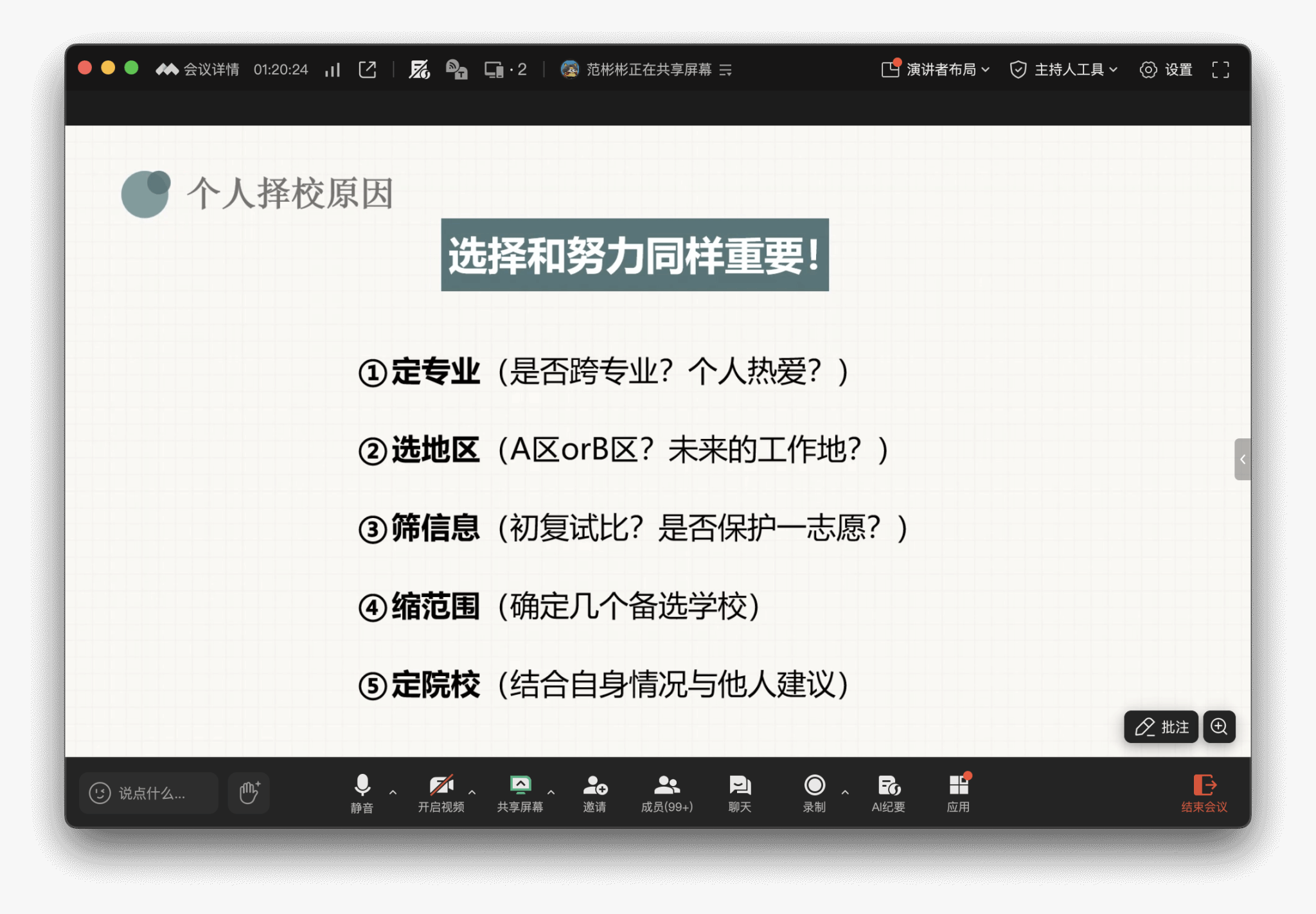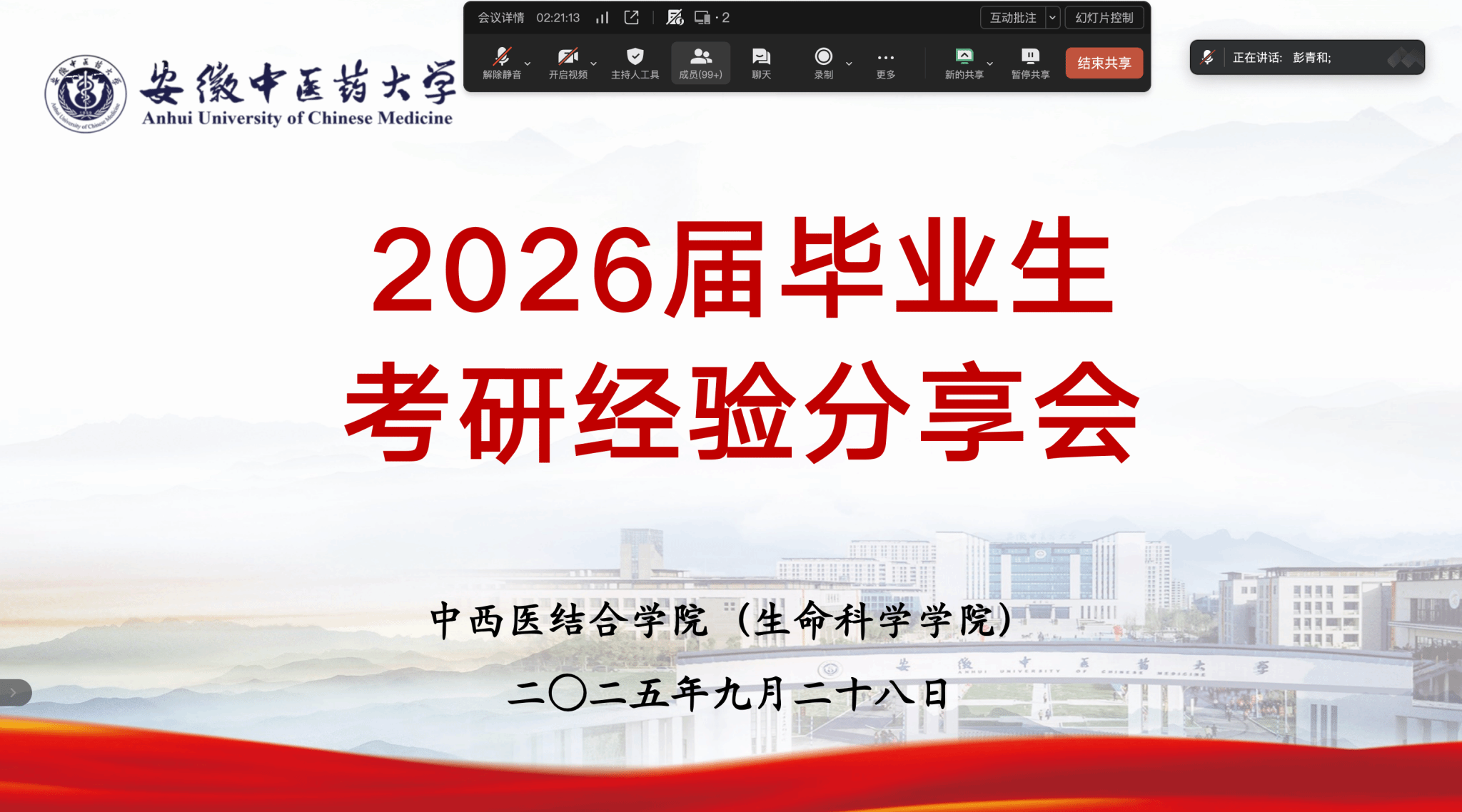 为助力2026届考研学子明确备考方向、优化复习策略、提振冲刺信心,9月28日晚,中西医结合学院以线上腾讯会议形式,成功举办2026届毕业生考研经验分享会。会议特别邀请2025届考研成功上岸的黄千梦、桑梦奇、刘婧雅、范彬彬和王明阳五位优秀毕业生担任主讲嘉宾,2026届毕业生及辅导员共同参会。经验分享会由学院就业办汪晓安老师主持。