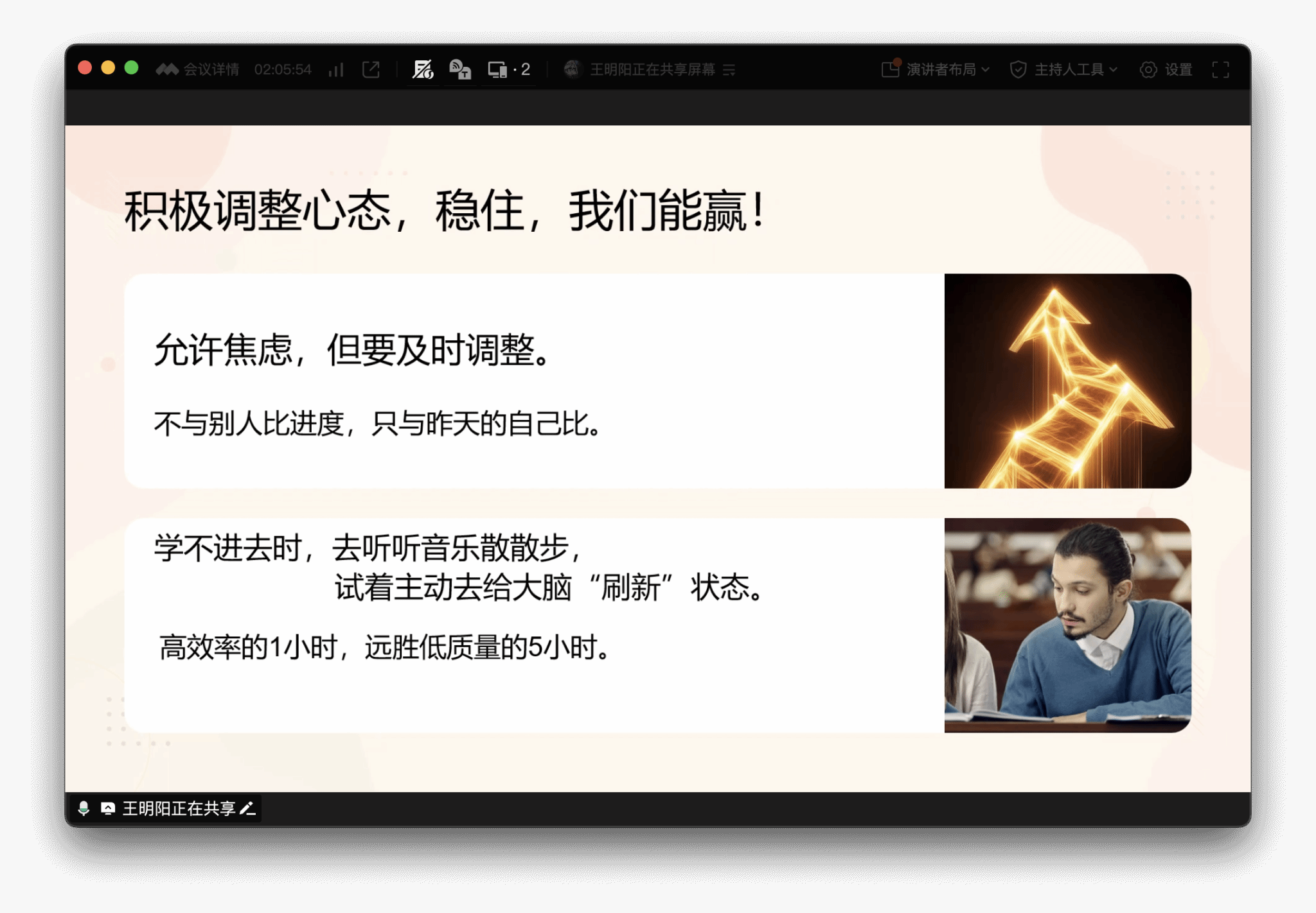 在分享会上,学院党委副书记彭青和从五个关键层面为同学们提供了实用的备考指导。一是做好“高瞻远瞩”的战略层面--院校选择;二是做好“稳如磐石”的心理层面--心态调整;三是做好“固本强基”的健康层面--身体素质;四是做好“精打细算”的保障层面--财力支持;五是做好“水滴石穿”的行动层面--坚持不懈,为正处于备考关键期的同学们指明了方向,厘清了思路。