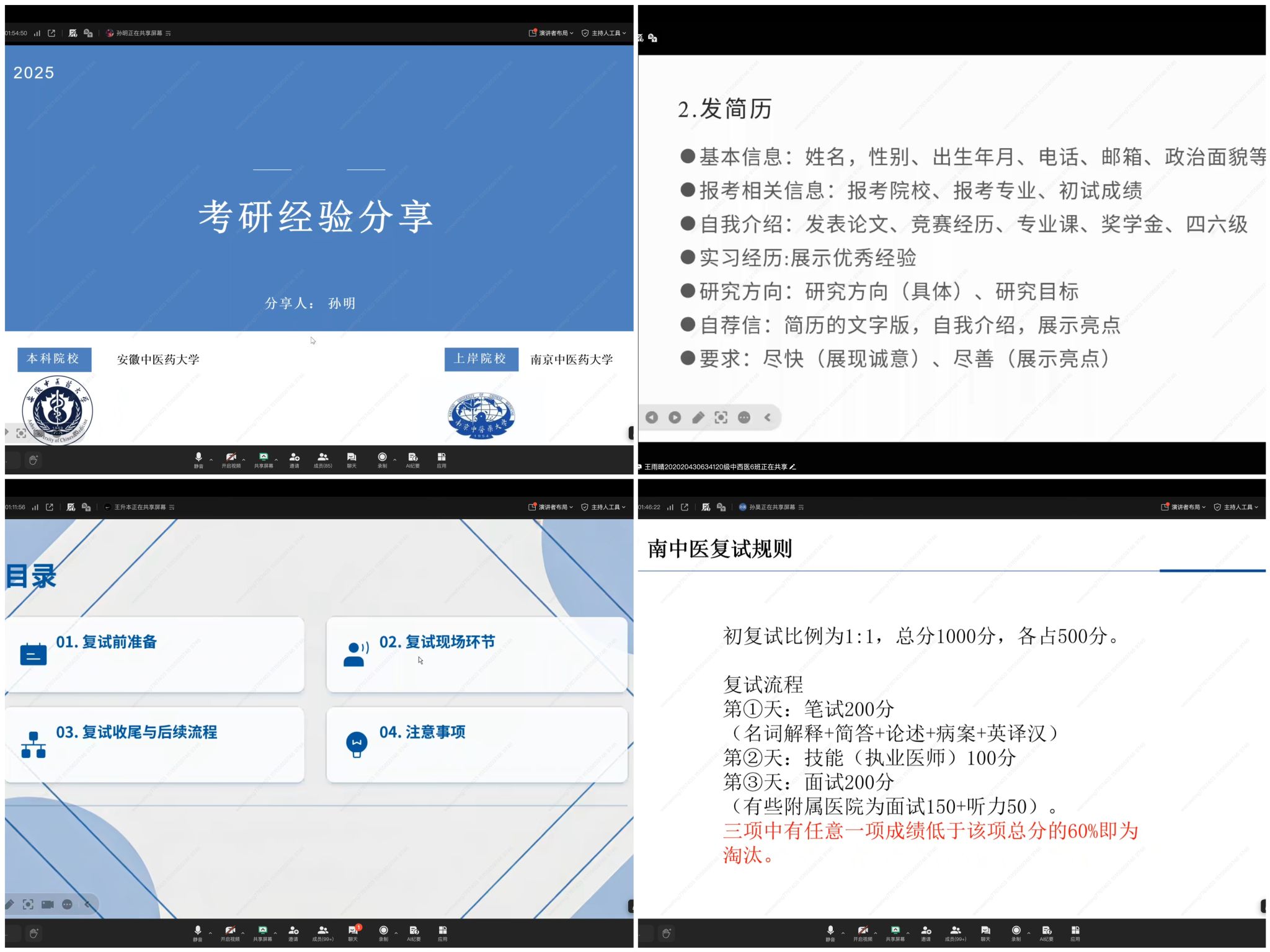 为助力2026届本科毕业生更好地备战考研复试,3月18日晚,中西医结合学院通过腾讯会议平台,以线上形式举办考研复试指导交流会。会议邀请2025届成功考取硕士研究生的王雨晴、王升本、孙昊和孙明四位优秀毕业生担任主讲嘉宾,学院2026届本科毕业生及辅导员参会。会议由学院就业办汪晓安老师主持。