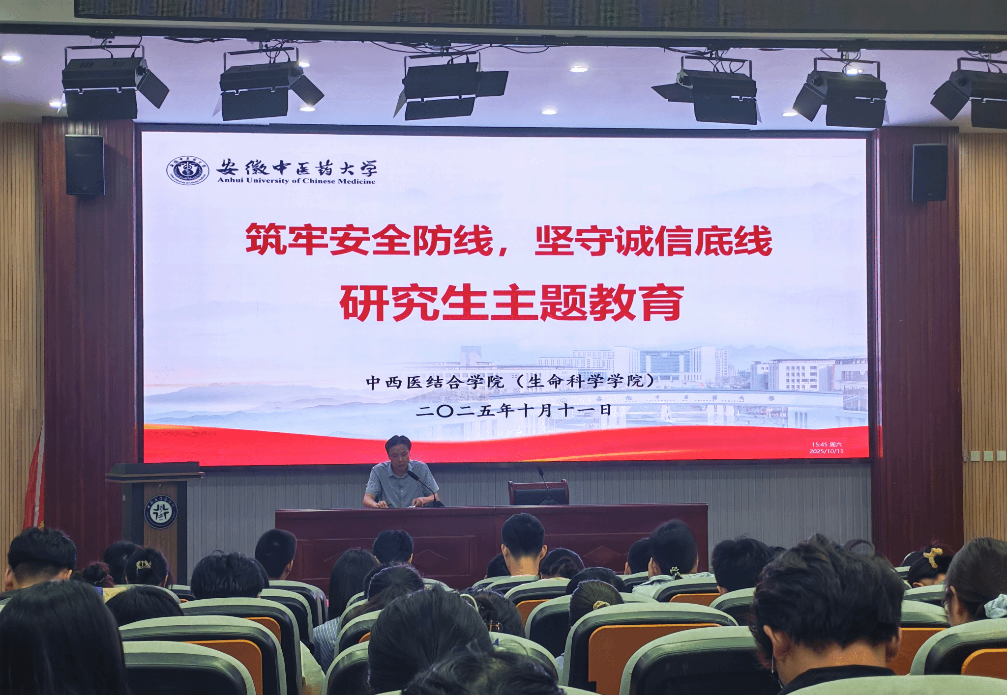 10月11日下午,中西医结合学院在学院254学术报告厅开展研究生“筑牢安全防线 坚守诚信底线”专题教育活动。学院2024级、2025级硕博士研究生参加了专题教育。专题教育由学院党委副书记彭青和主讲。