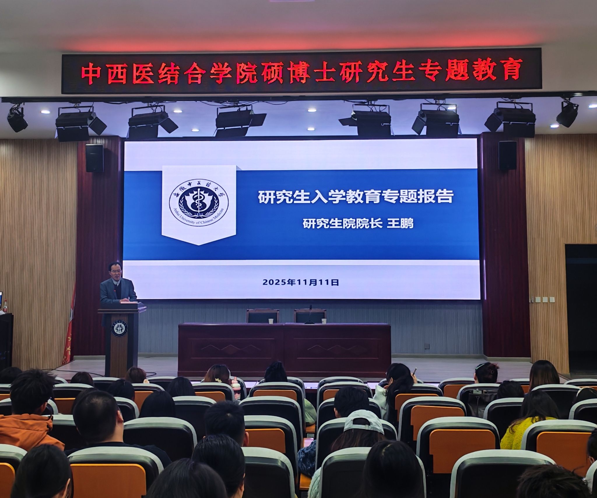 11月11日,中西医结合学院在B254会议厅举办2025级全体硕博研究生入学教育专题报告,邀请校研究生院院长王鹏教授作主题为《高等中医药教育与研究生人才培养》专题报告,学院2025级全体硕博士新生及部分高年级研究生参加了专题报告会。