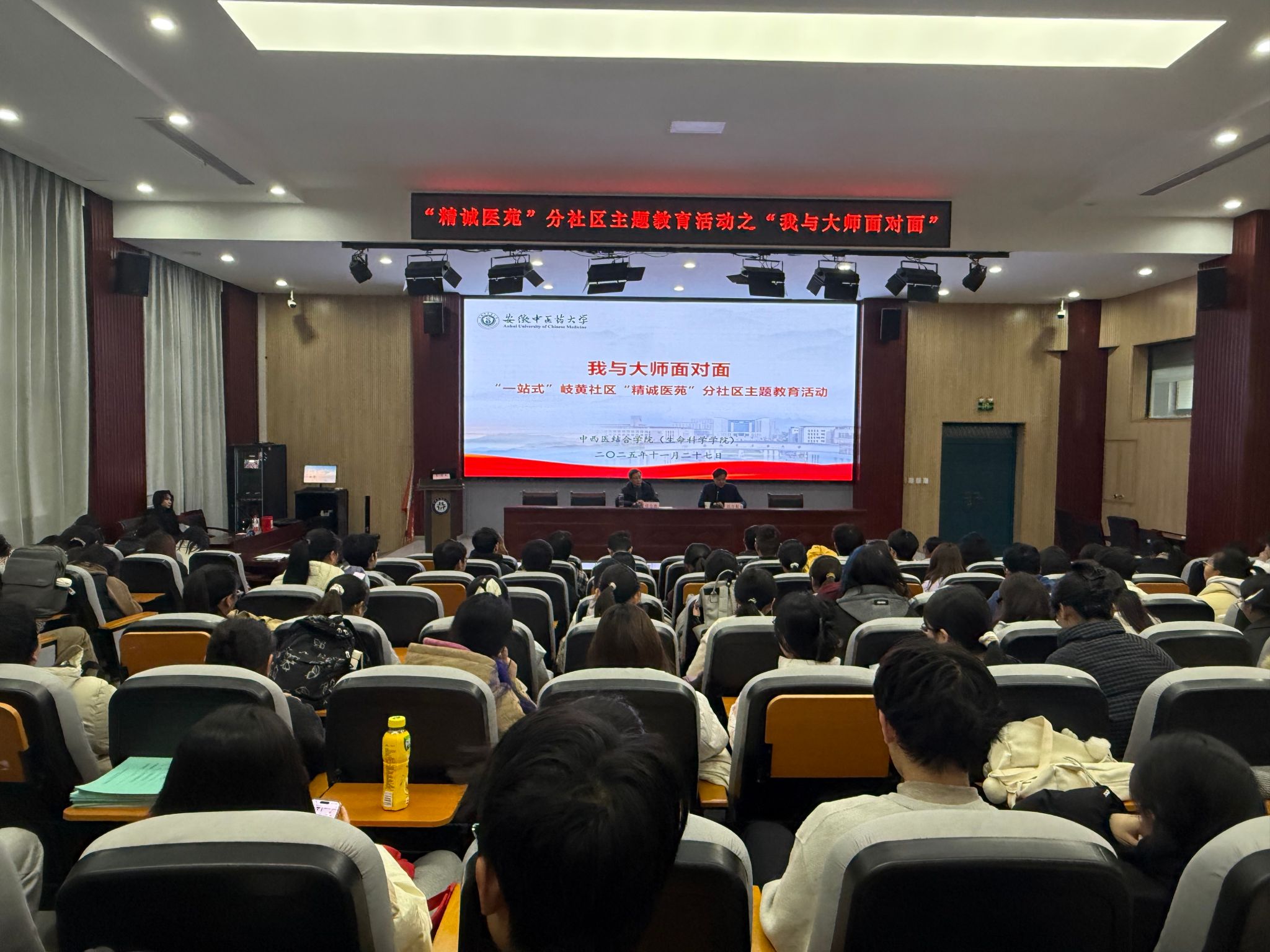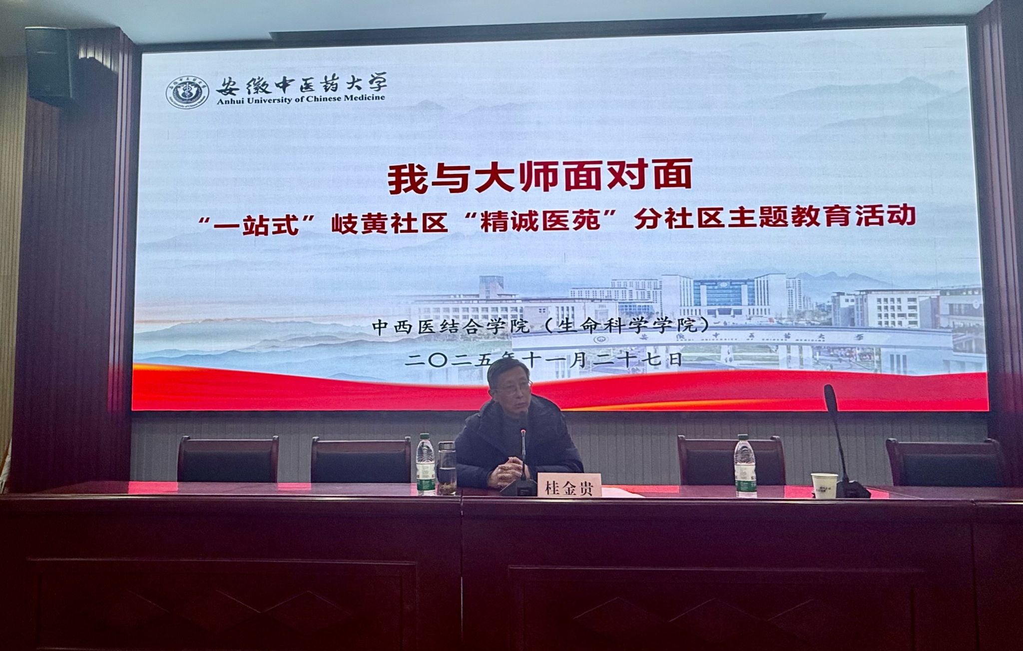 为加强学风建设,启迪学生思维,深化临床认知,“精诚医苑”分社区于11月27日下午举办了“我与大师面对面”活动。本次活动由中西医结合学院承办,邀请到原安徽省中医院儿科主任、知名儿科专家桂金贵主任医师,为学院学子带来一场以“一个核心,两大基石,三项能力”为主题的中医儿科医生的成长与思考分享。本次活动由学院党委副书记彭青和主持。
