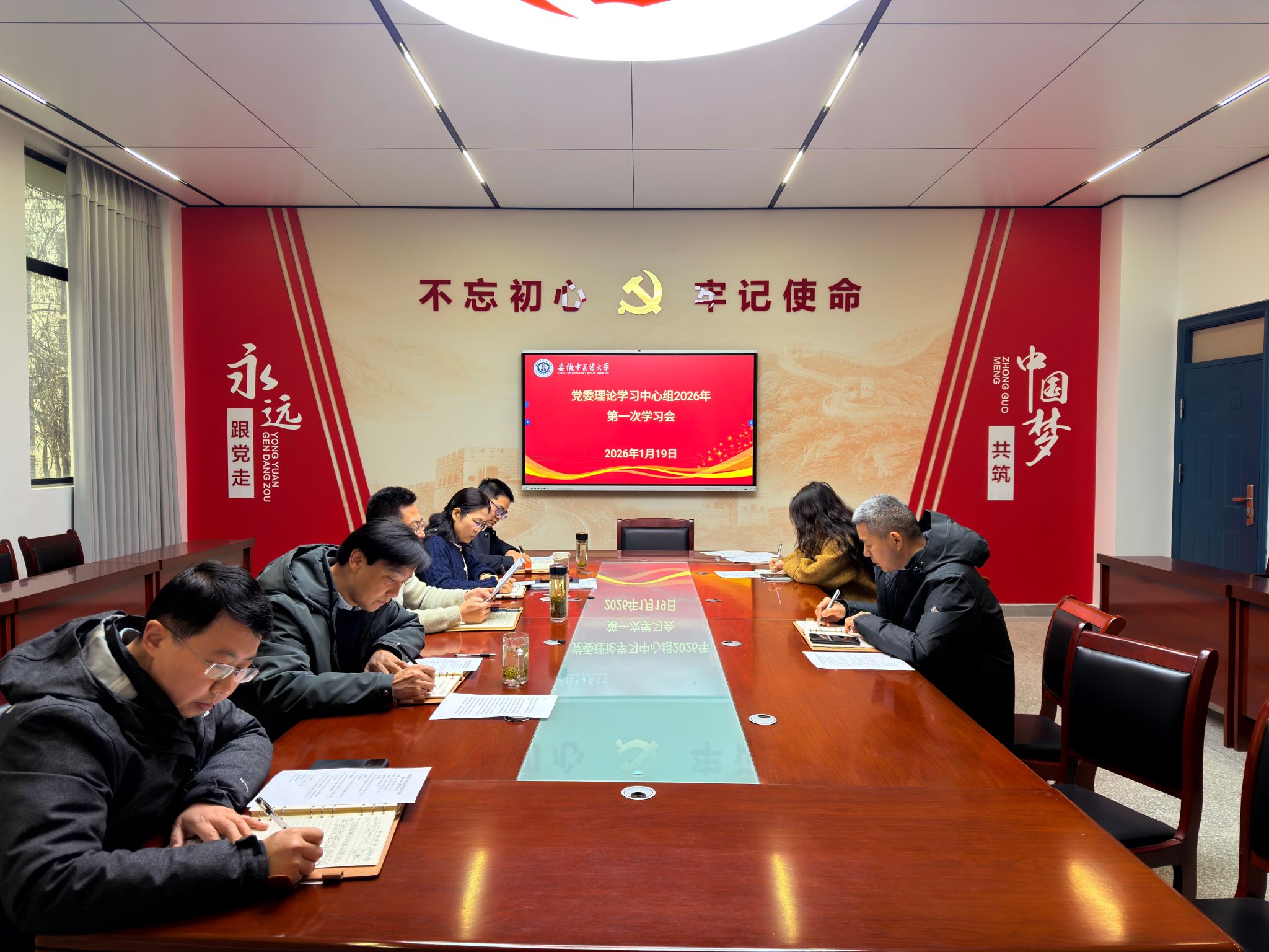 1月19日上午,中西医结合学院党委理论学习中心组在学院253党员活动室举行2026年第一次学习会。会议由学院党委书记李舰主持,全体党委委员参加。
