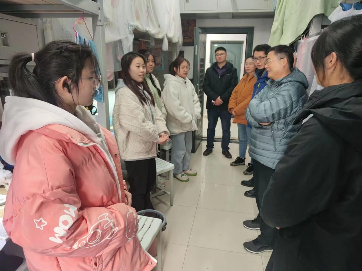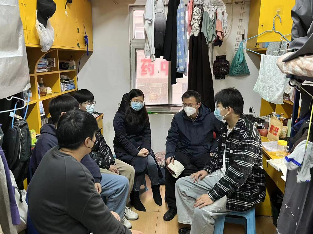 每到一个宿舍,领导与老师都与学生亲切交谈,详细了解学生的学习生活状况,对学生良好的学习态度、课业成绩、实践活动表示肯定,对互帮互助、团结友善、共同进步的同学关系给予表扬,对和谐融洽、积极向上、努力拼搏的宿舍氛围加以称赞,并嘱咐同学做好个人防护,保持身心健康。