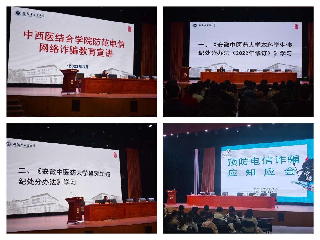 学院高度重视防诈骗教育宣传。3月15日,在大学生活动中心开展防范电信网络诈骗教育宣讲活动,全体辅导员、全体学生党员和学生干部参加,此次活动由学院党委副书记顾义俊主讲。顾义俊介绍了开学以来学校电信诈骗的典型案例,并结合高校易发的典型案例分析、常见形式和诈骗种类,为同学们讲解了不法份子常用的诈骗手法和作案特点,提醒大家提高防范意识,远离电信诈骗。另外,还带领同学们重温了《安徽中医药大学本科学生违纪处分办法(2022年修订)》和《安徽中医药大学研究生违纪处分办法》,进一步将文件精神贯彻落实到学院的反诈工作当中。