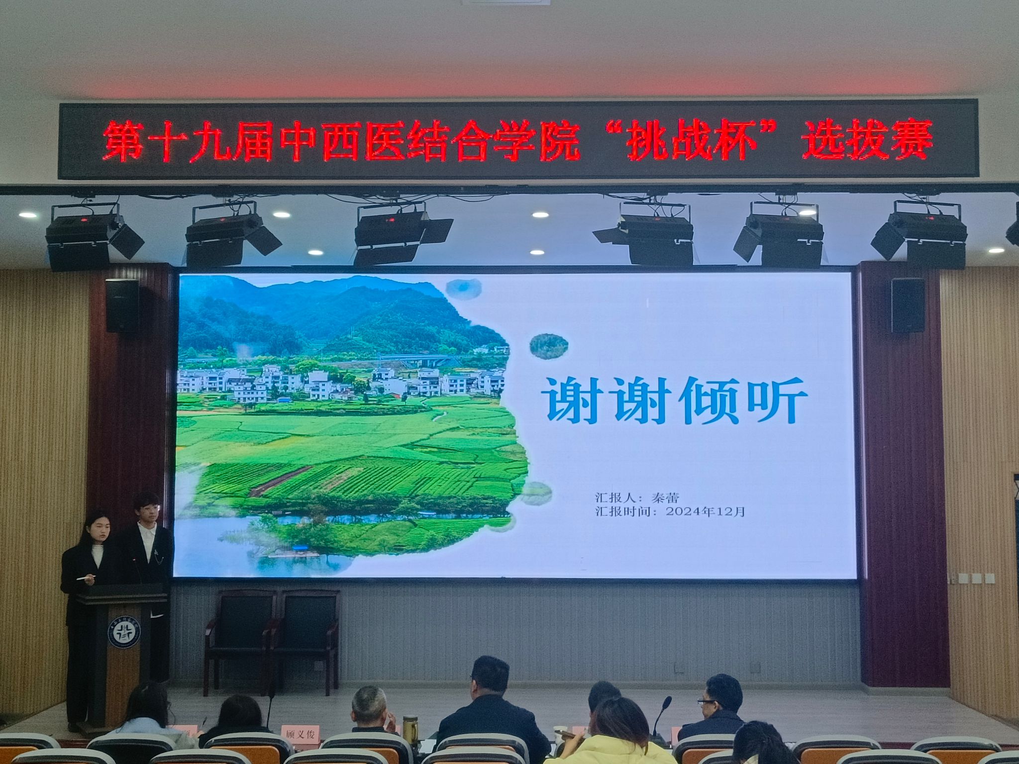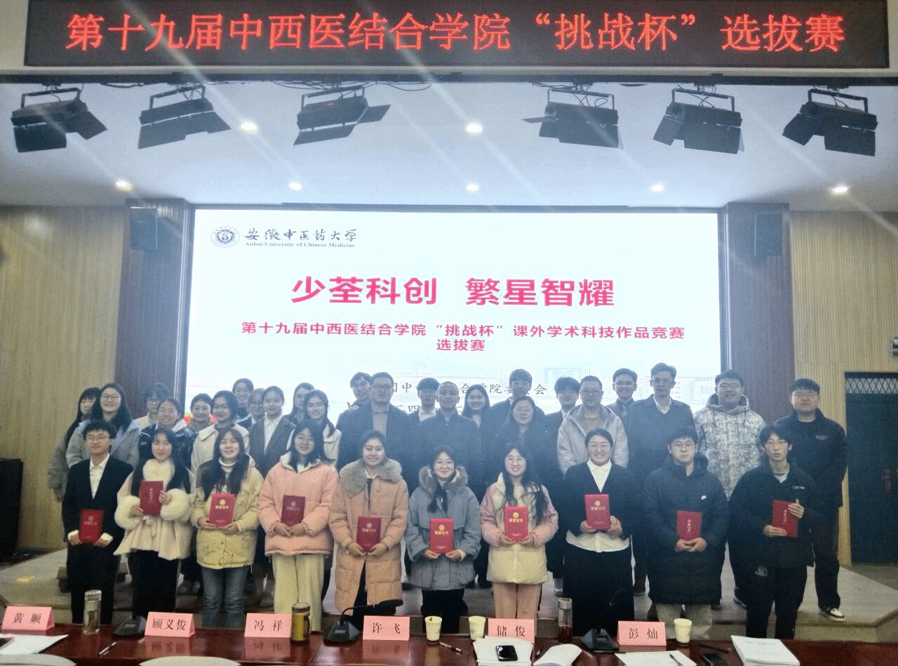 为激发创新思维,强化实践能力,培育科研人才,促进学术交流,展现青春风采,12月28日,中西医结合学院于学院楼B254报告厅举办2025年 “少荃科创” 挑战杯课外学术科技作品竞赛选拔活动。本次比赛经过申报书书面评审和线下路演答辩两轮选拔。担任现场比赛评委的有安徽省青年企业家协会副秘书长许飞、安徽中医药大学学生处处长冯祥、校新安医学教育部重点实验室现代实验技术教研室主任储俊、药学院实验实训教学中心主任彭灿、中西医结合学院党委副书记顾义俊以及中西医结合学院分团委书记黄顺。