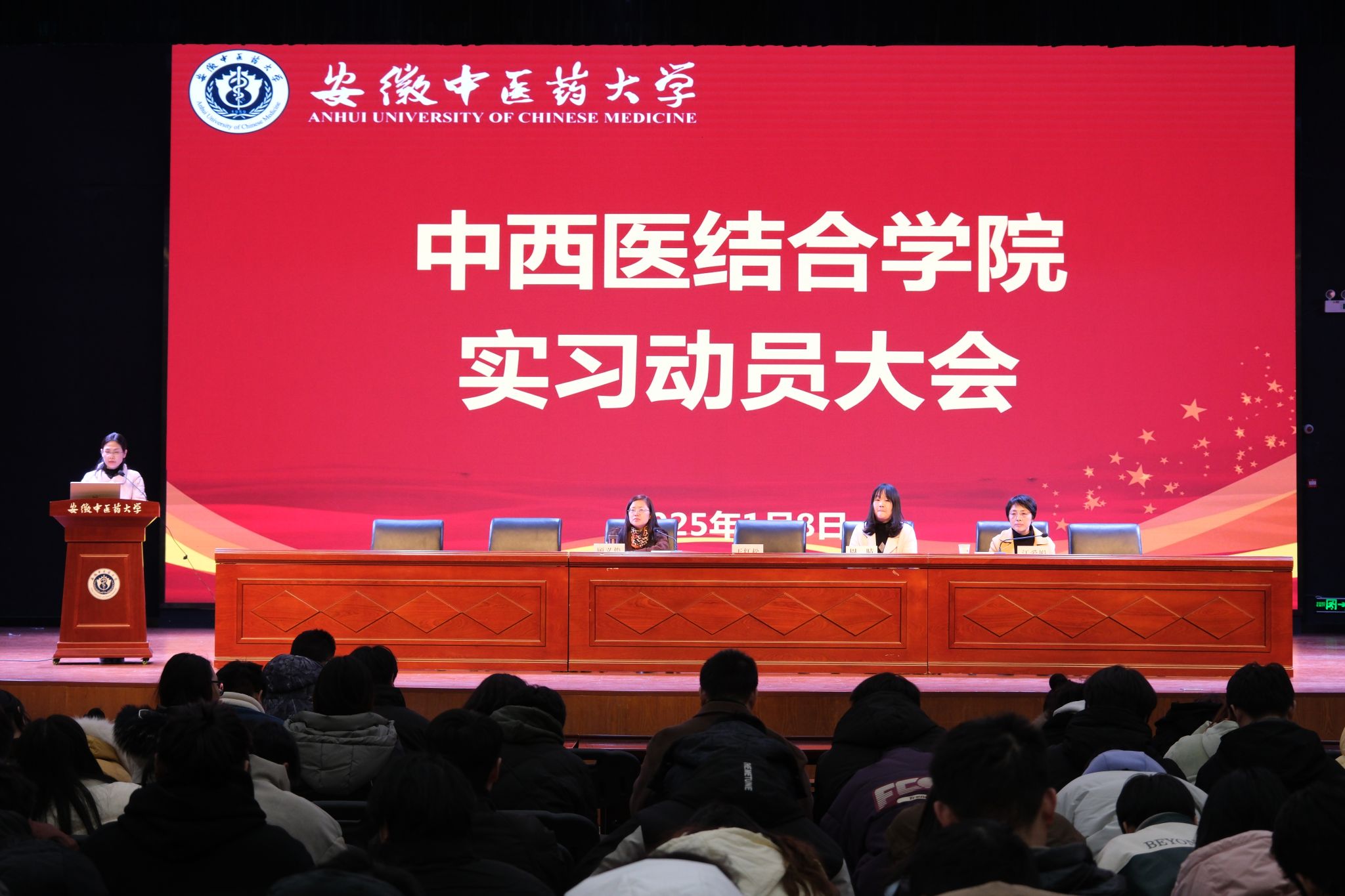 1月8下午,中西医结合学院在大学生活动中心召开2021级本科生实习动员大会。学校教务处副处长周晴,学院党政领导、实习秘书、辅导员和全体2021 级中西医临床医学专业同学参加会议,会义由学院党委副书记顾义俊主持。