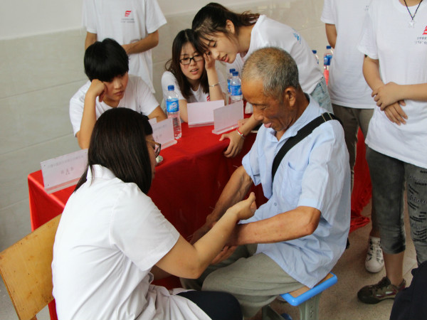 启动仪式结束后,义诊活动正式开始。前来咨询的村民络绎不绝,现场医生专家们望、闻、问、切,耐心地为群众解答各种健康问题。针灸专家翁玉芬当场为病人针灸,尽管开始村民有点害怕,但是通过针灸后,村民们赞不绝口。张奶奶在接受过针灸后,说这次义诊活动十分有意义,感受到了中医的博大精深。志愿者们为村民测血糖、量血压,宣传基本的疾病防治方法,大大提高了村民们的健康意识。