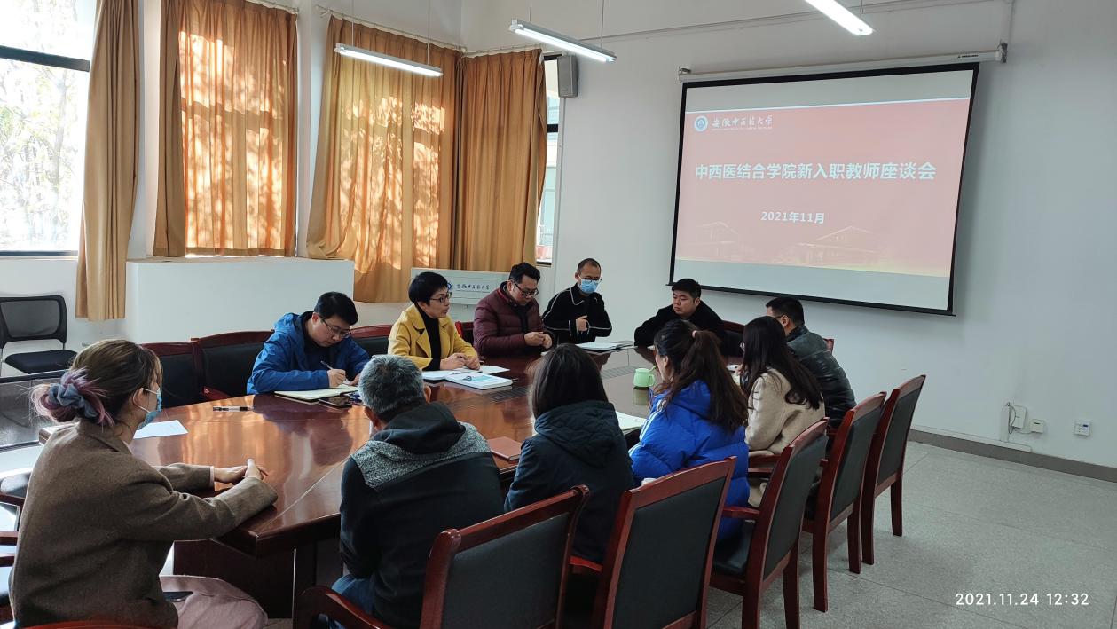 为让新教师尽快转变角色,了解新入职教师的教学和科研情况,11月24日下午,中西医结合学院召开新入职教师座谈会,学院副院长江爱娟、王靓及2021年新入职教师参会,会议由江爱娟主持。