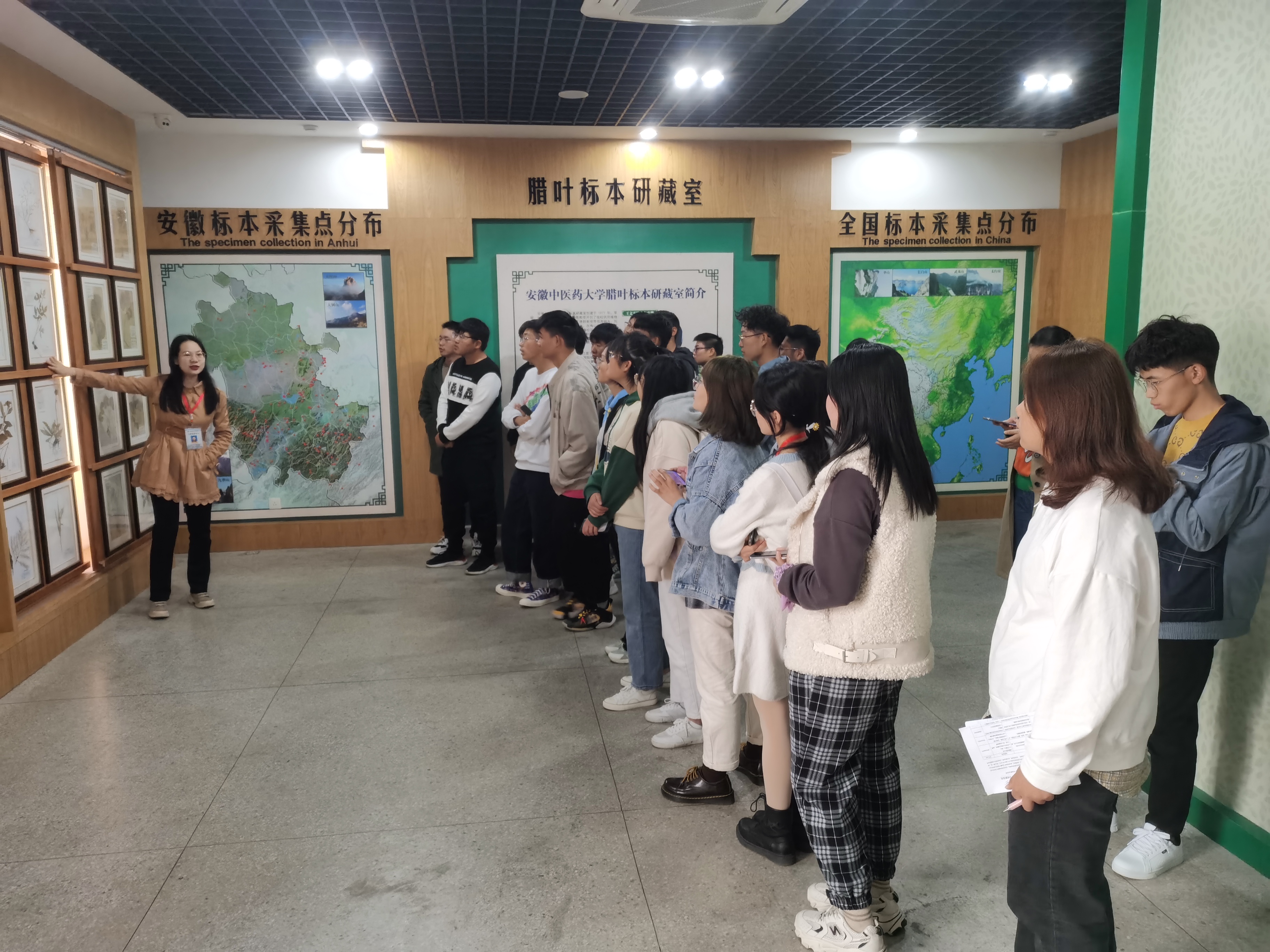 在中药资源中心,同学们有序地参观了六大馆室,积极地学习中药相关知识。在参观过程中,中药资源中心讲解员们给同学们做了详细解说,向大家展现了六大馆室的1000多个药物标本,500多种重点药材。此次参观让同学们了解了以前从很少涉及的各类中药信息及中药材的地区分布情况。讲解员详细的解说和耐心的答疑让新生了解到安徽中药资源特色,也感受到安徽历史悠久的本草文化。